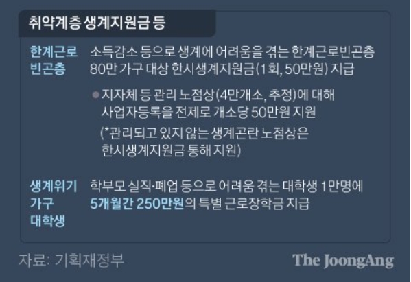 A. 정부는 소득 감소 등으로 생계에 어려움을 겪는 한계근로빈곤층 80만 가구를 대상으로 한시생계지원금을 50만원씩 지급하기로 했습니다. 특히 지방자체단체 등이 관리하는 약 4만개의 노점상에 대해 사업자 등록을 전제로 50만원씩 지원합니다. 여기에서 ‘관리 노점상’이란 점포임대료, 도료점용료 등을 납부하는 노점상을 말합니다. 관리 밖에 있는 노점상에 대해서는 각 지자체가 소득·재산 요건 등을 심사해 50만원씩 지급합니다.