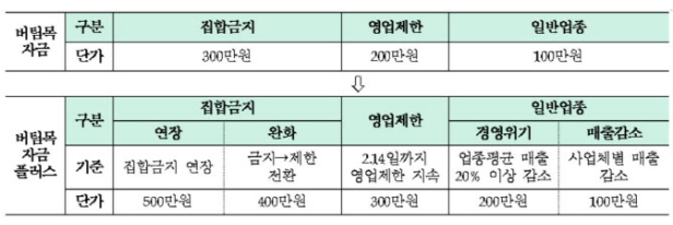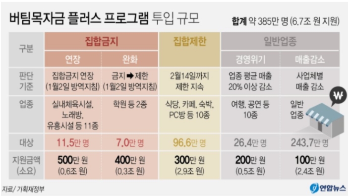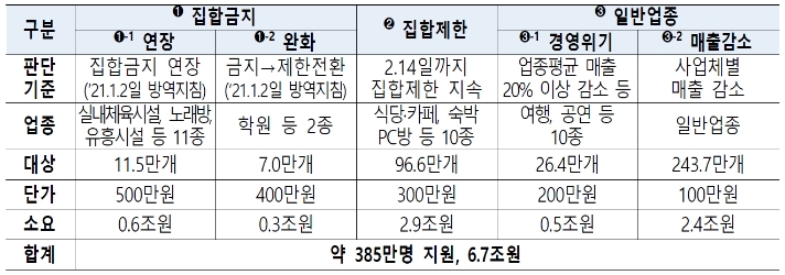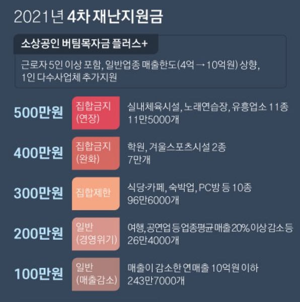 A. 정부는 5개 유형별로 지급액을 차등화했습니다. 집합금지가 연장된 11개 업종(실내체육시설·노래연습장·유흥업소 등)은 가장 많은 500만원을 받습니다. 집합금지가 완화된 학원·겨울스포츠시설 등 2개 업종에는 400만원을 지급합니다. 96만6000명에 달하는 식당·카페 등 집합제한 업종에는 300만원을 지급합니다. 여행·공연 등 업종 평균 매출이 20% 이상 감소한 경영위기 일반업종에는 200만원, 매출이 감소한 연매출 10억원 이하 일반업종에는 100만원을 지급합니다.