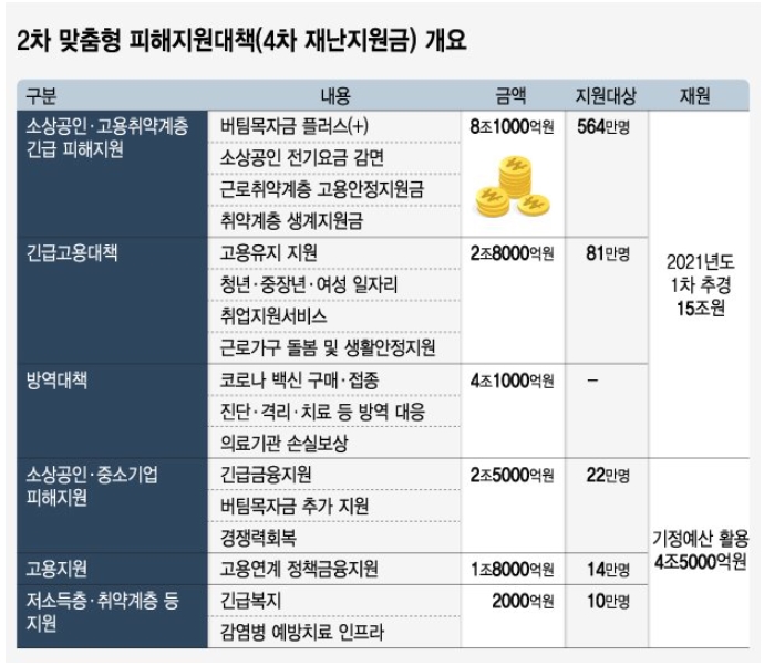 이와 함께 매출이 감소한 법인택시 기사 8만명에게도 고용안정자금 70만원이 지급됩니다. 다만 개인택시 기사는 3차 때와 마찬가지로 소상공인에게 지급되는 ‘버팀목자금 플러스’를 받습니다. 아울러 방문돌봄서비스 종사자 6만명은 생계안정지원금 50만원을 받을 수 있습니다.