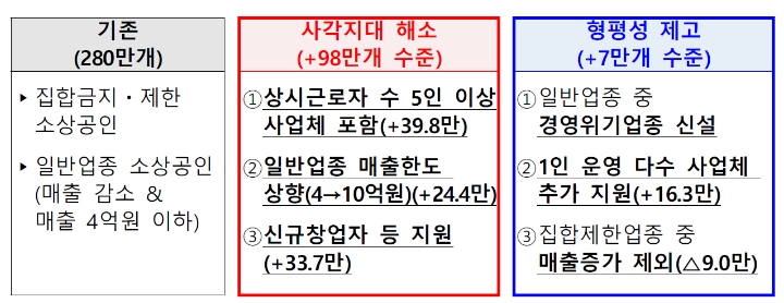 정부는 4차 재난지원금 지급 대상 소상공인을 총 385만명으로 추정했는데, 이는 3차 때보다 105만명 늘어난 수준입니다. 매출액 한도를 높이고, 상시근로자 수 기준을 없애고, 신규창업자를 포함하면서 대상이 많이 늘었습니다.